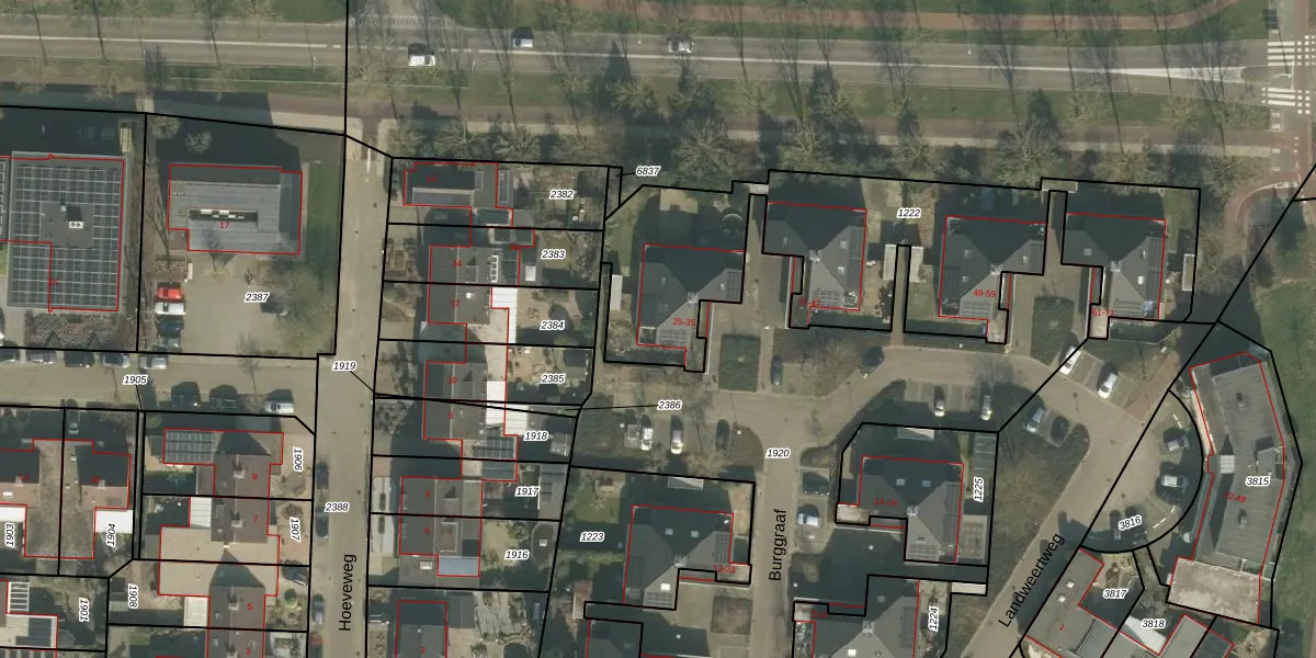 Het perceel waarop Burggraaf 25 staat heeft een oppervlakte van 1725 m². Dit is een zeer groot perceel. De perceeloppervlakte wordt geregistreerd door het Kadaster. Gedetailleerde informatie over de maten van dit perceel kunt u vinden in het rapport Kadastrale kaart met maatvoering van Burggraaf 25.