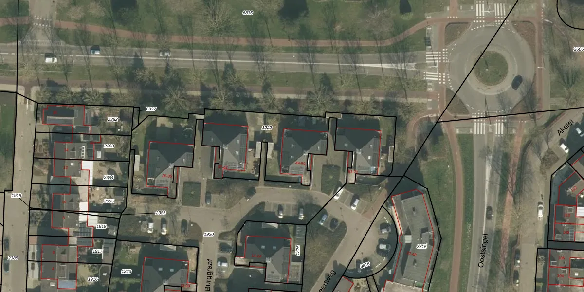 Het perceel waarop Burggraaf 53 staat heeft een oppervlakte van 1725 m². Dit is een zeer groot perceel. De perceeloppervlakte wordt geregistreerd door het Kadaster. Gedetailleerde informatie over de maten van dit perceel kunt u vinden in het rapport Kadastrale kaart met maatvoering van Burggraaf 53.