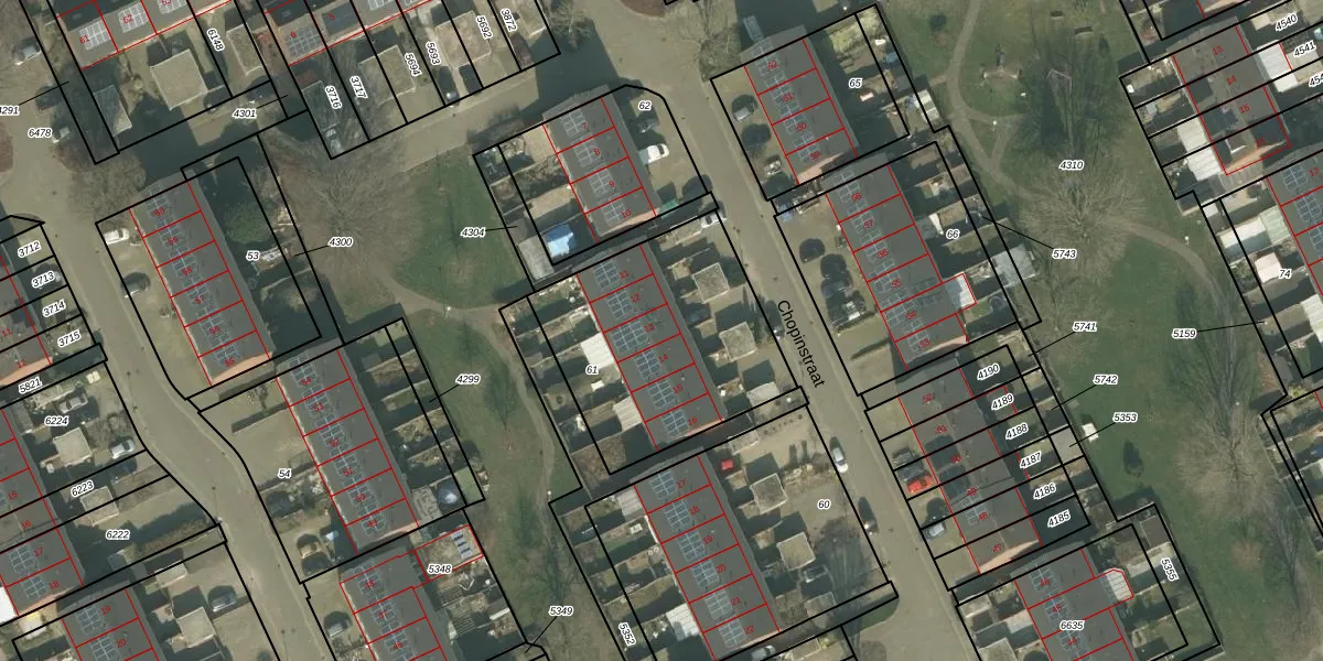 Het perceel waarop Chopinstraat 13 staat heeft een oppervlakte van 950 m². Dit is een groot perceel. De perceeloppervlakte wordt geregistreerd door het Kadaster. Gedetailleerde informatie over de maten van dit perceel kunt u vinden in het rapport Kadastrale kaart met maatvoering van Chopinstraat 13.