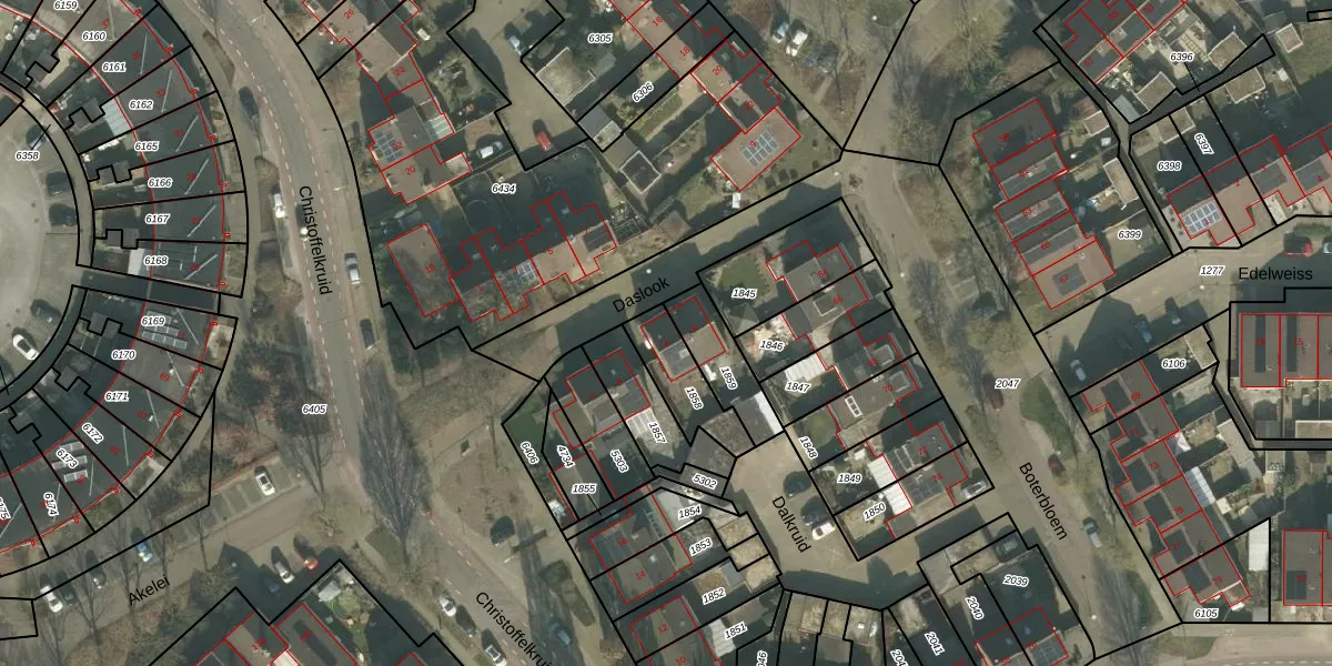 Het perceel waarop Daslook 6 staat heeft een oppervlakte van 165 m². Dit is een middelgroot perceel. De perceeloppervlakte wordt geregistreerd door het Kadaster. Gedetailleerde informatie over de maten van dit perceel kunt u vinden in het rapport Kadastrale kaart met maatvoering van Daslook 6.