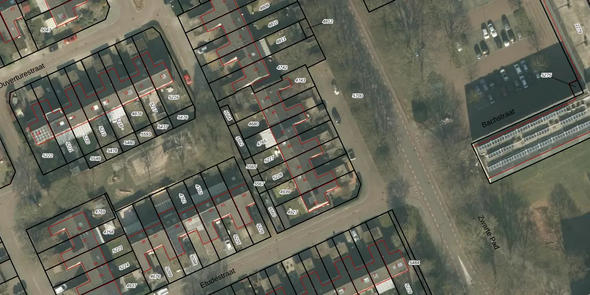 Het perceel waarop Etudestraat 46 staat heeft een oppervlakte van 187 m². Dit is een middelgroot perceel. De perceeloppervlakte wordt geregistreerd door het Kadaster. Gedetailleerde informatie over de maten van dit perceel kunt u vinden in het rapport Kadastrale kaart met maatvoering van Etudestraat 46.