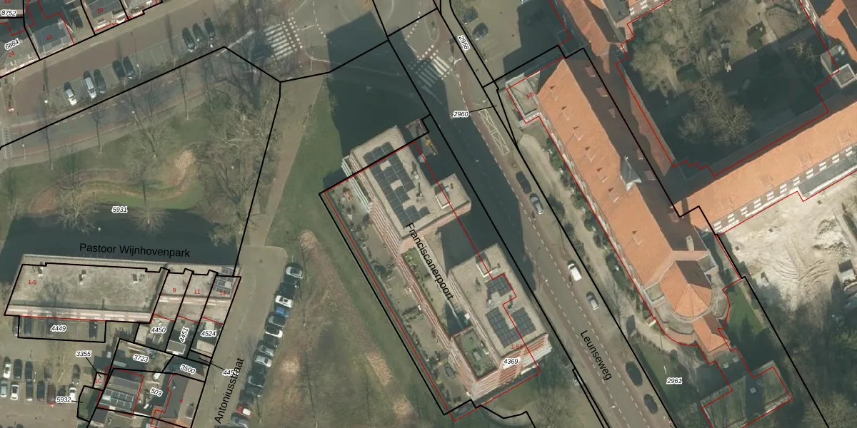 Het perceel waarop Franciscanerpoort 21 staat heeft een oppervlakte van 3250 m². Dit is een zeer groot perceel. De perceeloppervlakte wordt geregistreerd door het Kadaster. Gedetailleerde informatie over de maten van dit perceel kunt u vinden in het rapport Kadastrale kaart met maatvoering van Franciscanerpoort 21.