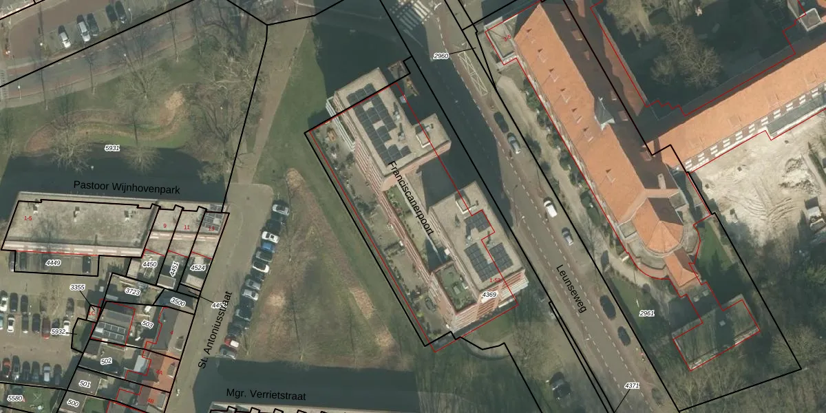 Het perceel waarop Franciscanerpoort 40 staat heeft een oppervlakte van 3250 m². Dit is een zeer groot perceel. De perceeloppervlakte wordt geregistreerd door het Kadaster. Gedetailleerde informatie over de maten van dit perceel kunt u vinden in het rapport Kadastrale kaart met maatvoering van Franciscanerpoort 40.