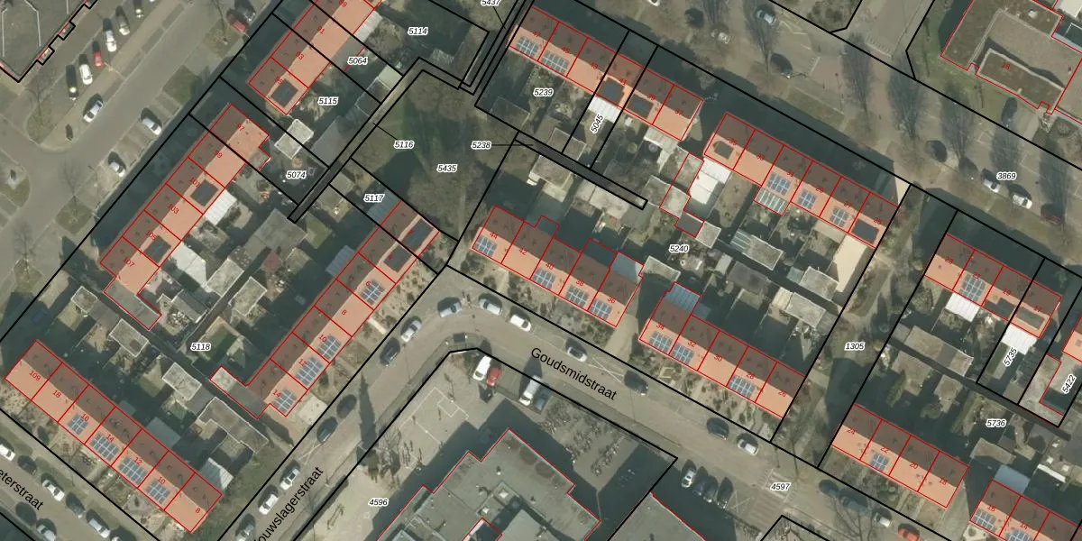 Het perceel waarop Goudsmidstraat 40 staat heeft een oppervlakte van 3278 m². Dit is een zeer groot perceel. De perceeloppervlakte wordt geregistreerd door het Kadaster. Gedetailleerde informatie over de maten van dit perceel kunt u vinden in het rapport Kadastrale kaart met maatvoering van Goudsmidstraat 40.