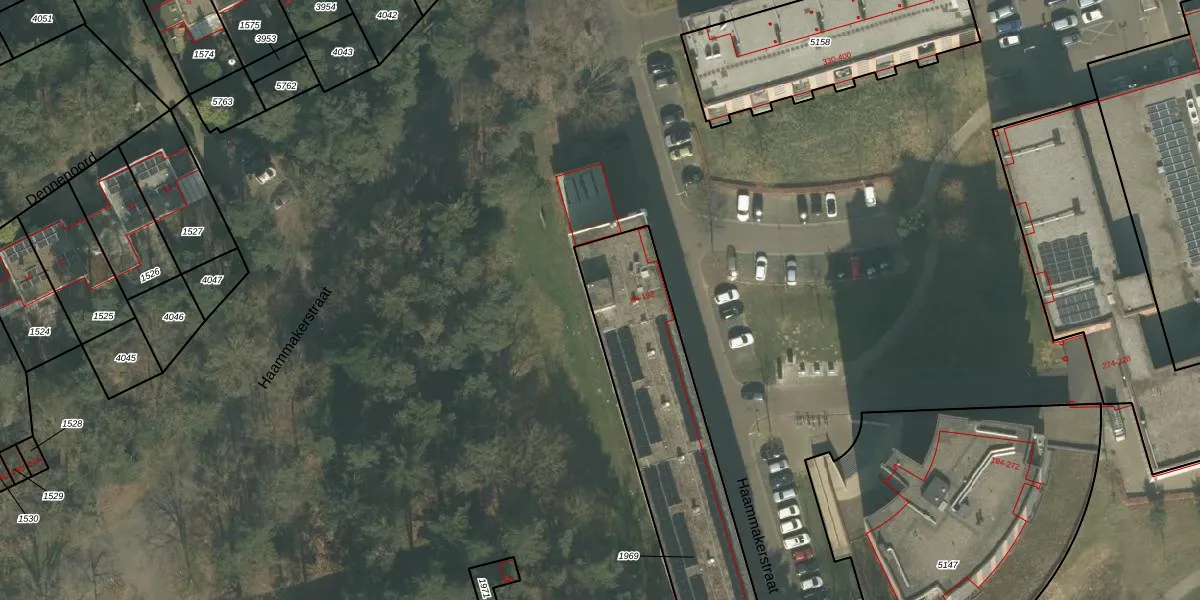 Het perceel waarop Haammakerstraat 102 staat heeft een oppervlakte van 979 m². Dit is een groot perceel. De perceeloppervlakte wordt geregistreerd door het Kadaster. Gedetailleerde informatie over de maten van dit perceel kunt u vinden in het rapport Kadastrale kaart met maatvoering van Haammakerstraat 102.