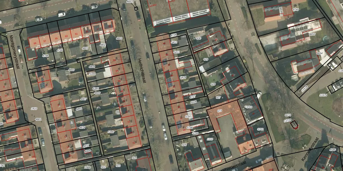 Het perceel waarop Helfrichstraat 61 staat heeft een oppervlakte van 441 m². Dit is een groot perceel. De perceeloppervlakte wordt geregistreerd door het Kadaster. Gedetailleerde informatie over de maten van dit perceel kunt u vinden in het rapport Kadastrale kaart met maatvoering van Helfrichstraat 61.