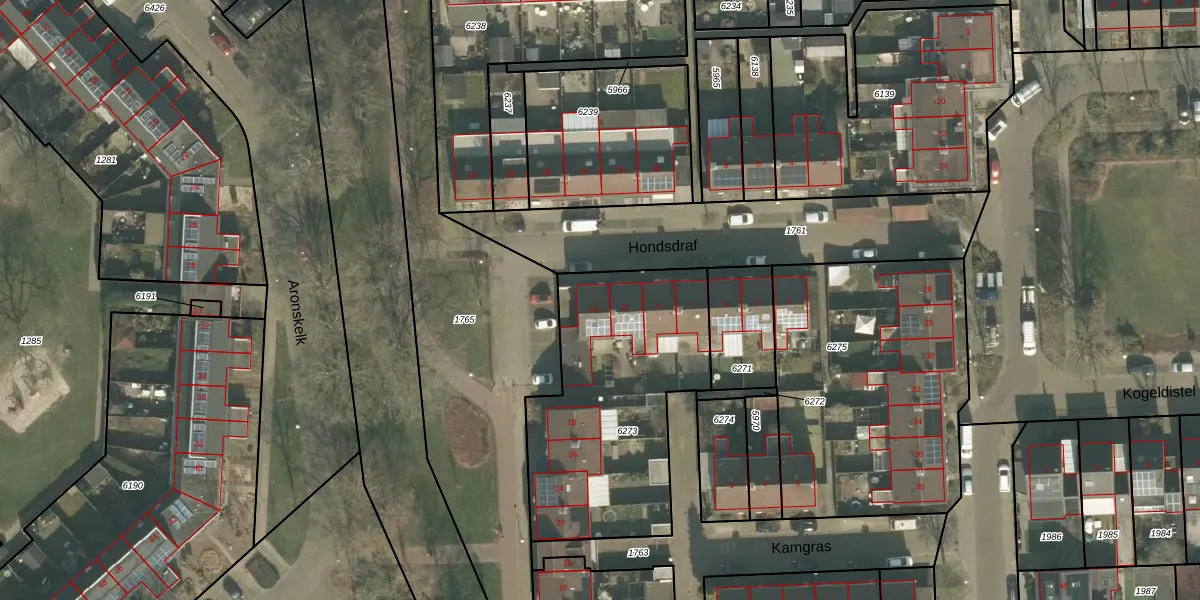Het perceel waarop Hondsdraf 13 staat heeft een oppervlakte van 1065 m². Dit is een zeer groot perceel. De perceeloppervlakte wordt geregistreerd door het Kadaster. Gedetailleerde informatie over de maten van dit perceel kunt u vinden in het rapport Kadastrale kaart met maatvoering van Hondsdraf 13.