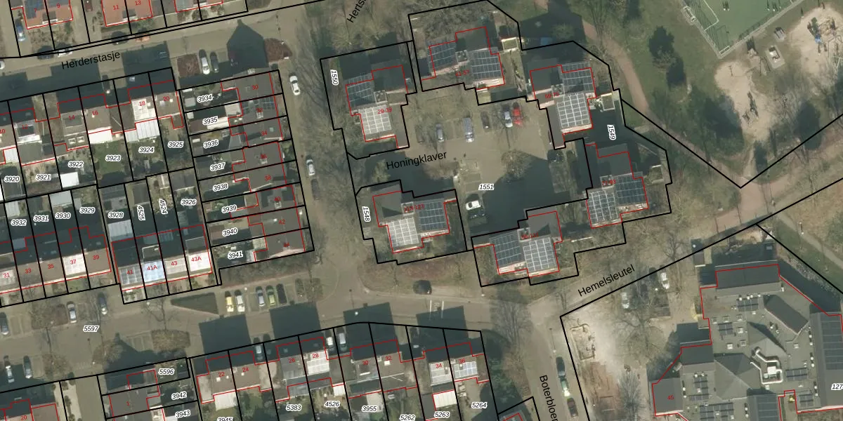 Het perceel waarop Honingklaver 121 staat heeft een oppervlakte van 395 m². Dit is een groot perceel. De perceeloppervlakte wordt geregistreerd door het Kadaster. Gedetailleerde informatie over de maten van dit perceel kunt u vinden in het rapport Kadastrale kaart met maatvoering van Honingklaver 121.