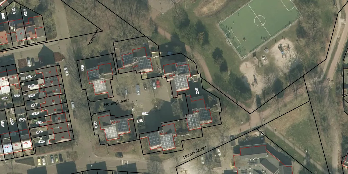Het perceel waarop Honingklaver 63 staat heeft een oppervlakte van 1760 m². Dit is een zeer groot perceel. De perceeloppervlakte wordt geregistreerd door het Kadaster. Gedetailleerde informatie over de maten van dit perceel kunt u vinden in het rapport Kadastrale kaart met maatvoering van Honingklaver 63.