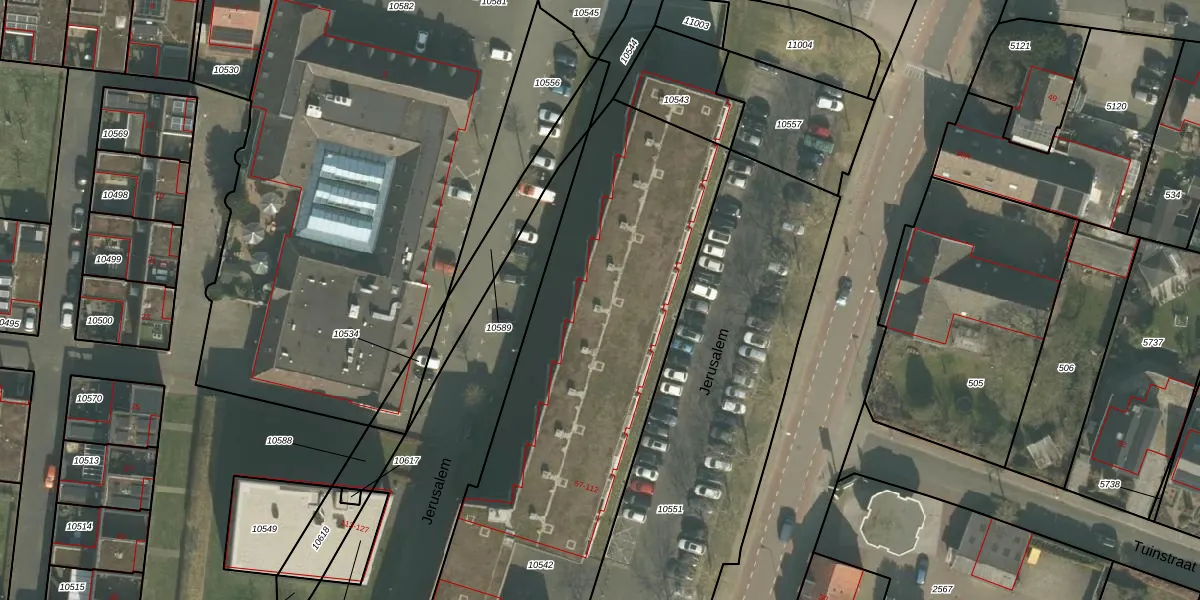 Het perceel waarop Jerusalem 106 staat heeft een oppervlakte van 4075 m². Dit is een zeer groot perceel. De perceeloppervlakte wordt geregistreerd door het Kadaster. Gedetailleerde informatie over de maten van dit perceel kunt u vinden in het rapport Kadastrale kaart met maatvoering van Jerusalem 106.