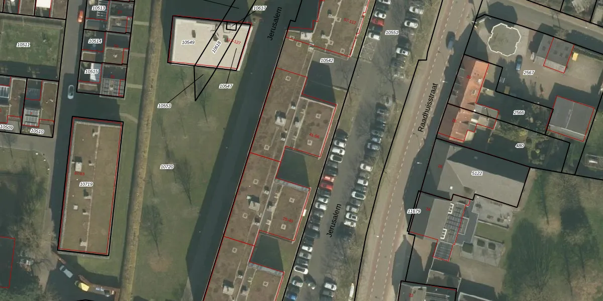 Het perceel waarop Jerusalem 45 staat heeft een oppervlakte van 4075 m². Dit is een zeer groot perceel. De perceeloppervlakte wordt geregistreerd door het Kadaster. Gedetailleerde informatie over de maten van dit perceel kunt u vinden in het rapport Kadastrale kaart met maatvoering van Jerusalem 45.