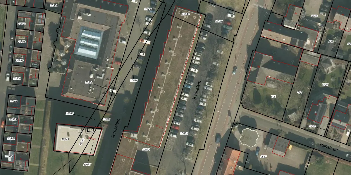 Het perceel waarop Jerusalem 61 staat heeft een oppervlakte van 4075 m². Dit is een zeer groot perceel. De perceeloppervlakte wordt geregistreerd door het Kadaster. Gedetailleerde informatie over de maten van dit perceel kunt u vinden in het rapport Kadastrale kaart met maatvoering van Jerusalem 61.