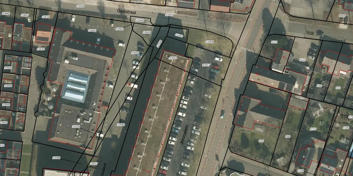 Het perceel waarop Jerusalem 65 staat heeft een oppervlakte van 4075 m². Dit is een zeer groot perceel. De perceeloppervlakte wordt geregistreerd door het Kadaster. Gedetailleerde informatie over de maten van dit perceel kunt u vinden in het rapport Kadastrale kaart met maatvoering van Jerusalem 65.