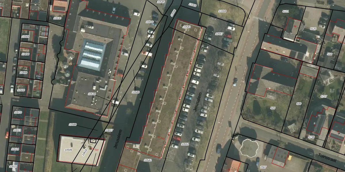 Het perceel waarop Jerusalem 83 staat heeft een oppervlakte van 4075 m². Dit is een zeer groot perceel. De perceeloppervlakte wordt geregistreerd door het Kadaster. Gedetailleerde informatie over de maten van dit perceel kunt u vinden in het rapport Kadastrale kaart met maatvoering van Jerusalem 83.