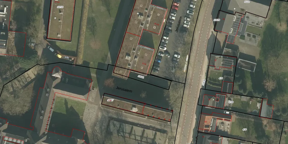 Het perceel waarop Jerusalem 9 staat heeft een oppervlakte van 4075 m². Dit is een zeer groot perceel. De perceeloppervlakte wordt geregistreerd door het Kadaster. Gedetailleerde informatie over de maten van dit perceel kunt u vinden in het rapport Kadastrale kaart met maatvoering van Jerusalem 9.