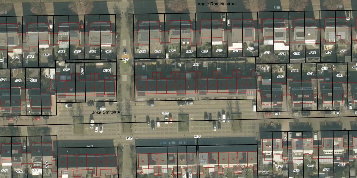 Het perceel waarop Joke Smitstraat 39 staat heeft een oppervlakte van 1621 m². Dit is een zeer groot perceel. De perceeloppervlakte wordt geregistreerd door het Kadaster. Gedetailleerde informatie over de maten van dit perceel kunt u vinden in het rapport Kadastrale kaart met maatvoering van Joke Smitstraat 39.