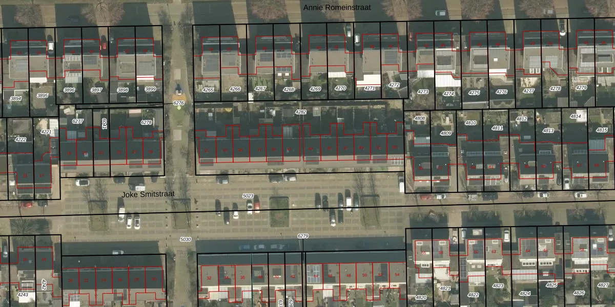 Het perceel waarop Joke Smitstraat 43 staat heeft een oppervlakte van 1621 m². Dit is een zeer groot perceel. De perceeloppervlakte wordt geregistreerd door het Kadaster. Gedetailleerde informatie over de maten van dit perceel kunt u vinden in het rapport Kadastrale kaart met maatvoering van Joke Smitstraat 43.