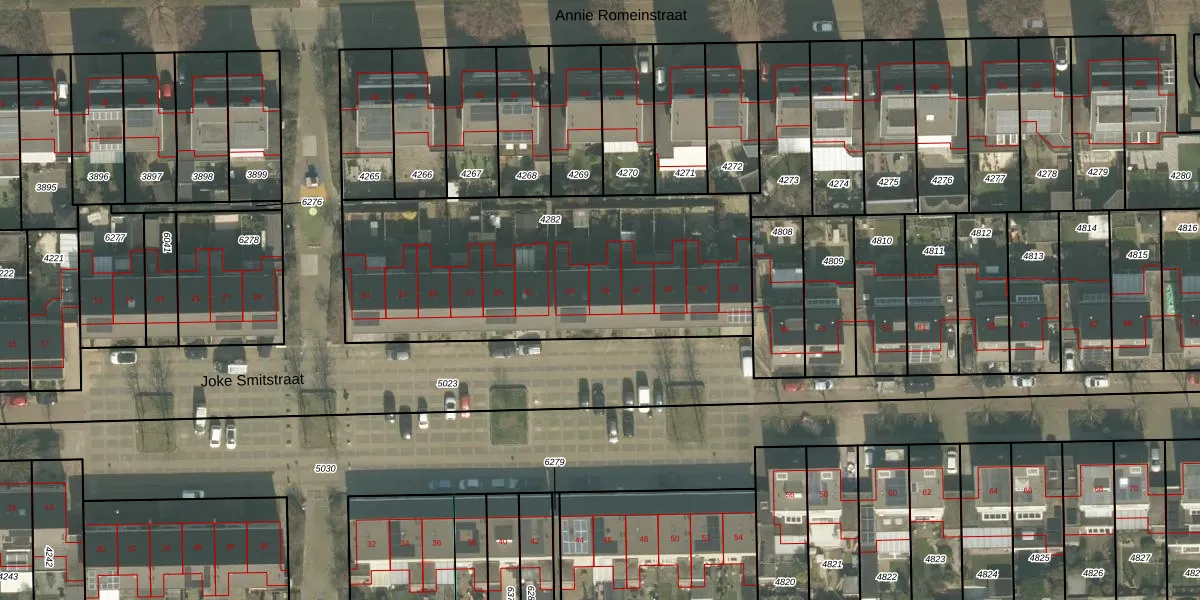 Het perceel waarop Joke Smitstraat 45 staat heeft een oppervlakte van 1621 m². Dit is een zeer groot perceel. De perceeloppervlakte wordt geregistreerd door het Kadaster. Gedetailleerde informatie over de maten van dit perceel kunt u vinden in het rapport Kadastrale kaart met maatvoering van Joke Smitstraat 45.