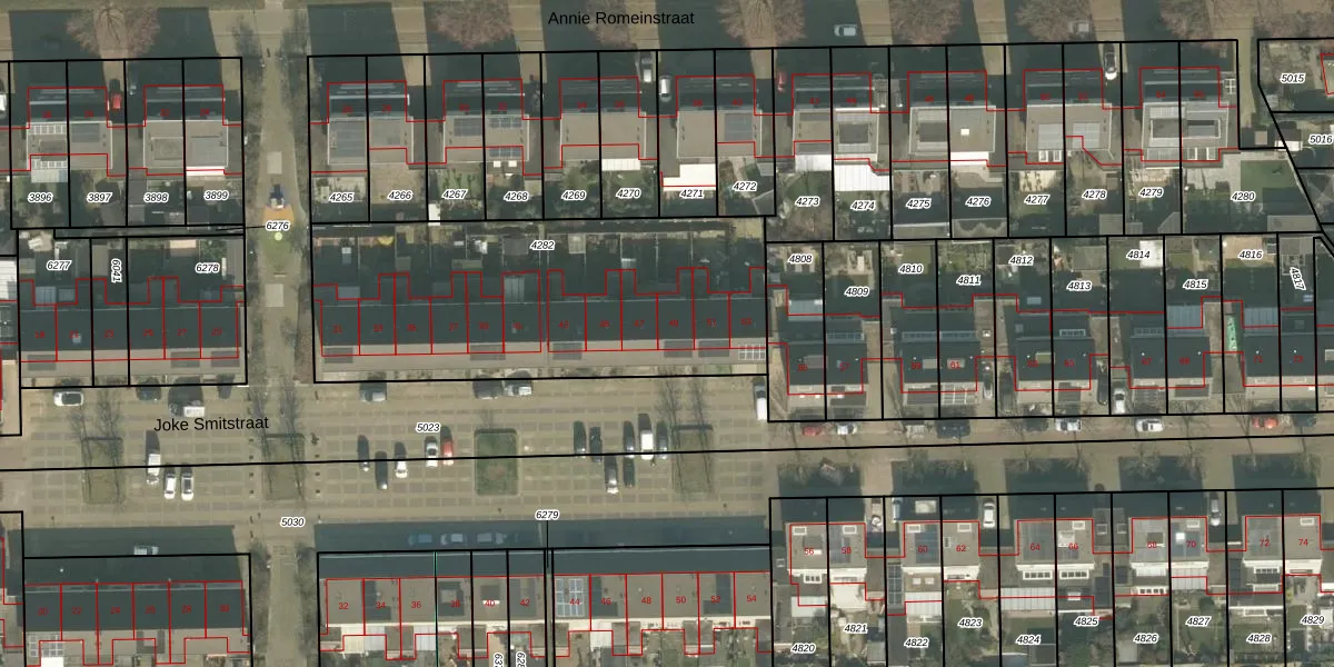 Het perceel waarop Joke Smitstraat 49 staat heeft een oppervlakte van 1621 m². Dit is een zeer groot perceel. De perceeloppervlakte wordt geregistreerd door het Kadaster. Gedetailleerde informatie over de maten van dit perceel kunt u vinden in het rapport Kadastrale kaart met maatvoering van Joke Smitstraat 49.