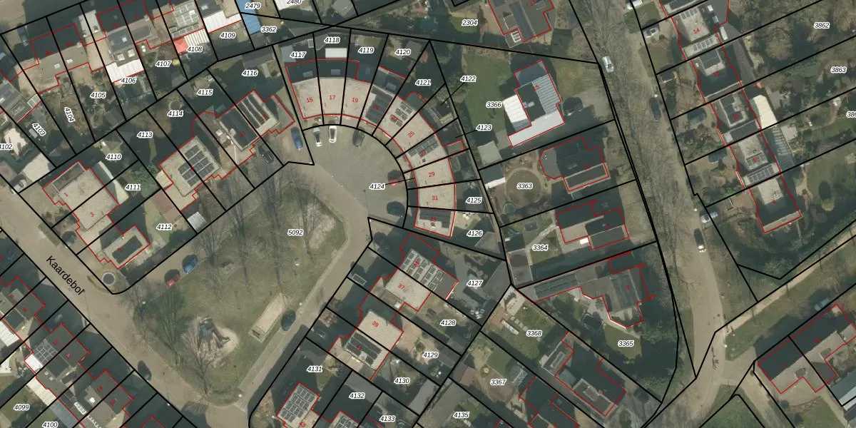 Het perceel waarop Kaardebol 33 staat heeft een oppervlakte van 178 m². Dit is een middelgroot perceel. De perceeloppervlakte wordt geregistreerd door het Kadaster. Gedetailleerde informatie over de maten van dit perceel kunt u vinden in het rapport Kadastrale kaart met maatvoering van Kaardebol 33.