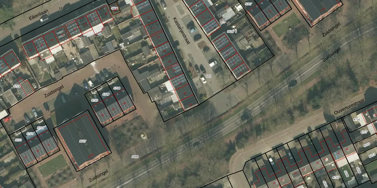 Het perceel waarop Kastanjestraat 20 staat heeft een oppervlakte van 5753 m². Dit is een zeer groot perceel. De perceeloppervlakte wordt geregistreerd door het Kadaster. Gedetailleerde informatie over de maten van dit perceel kunt u vinden in het rapport Kadastrale kaart met maatvoering van Kastanjestraat 20.