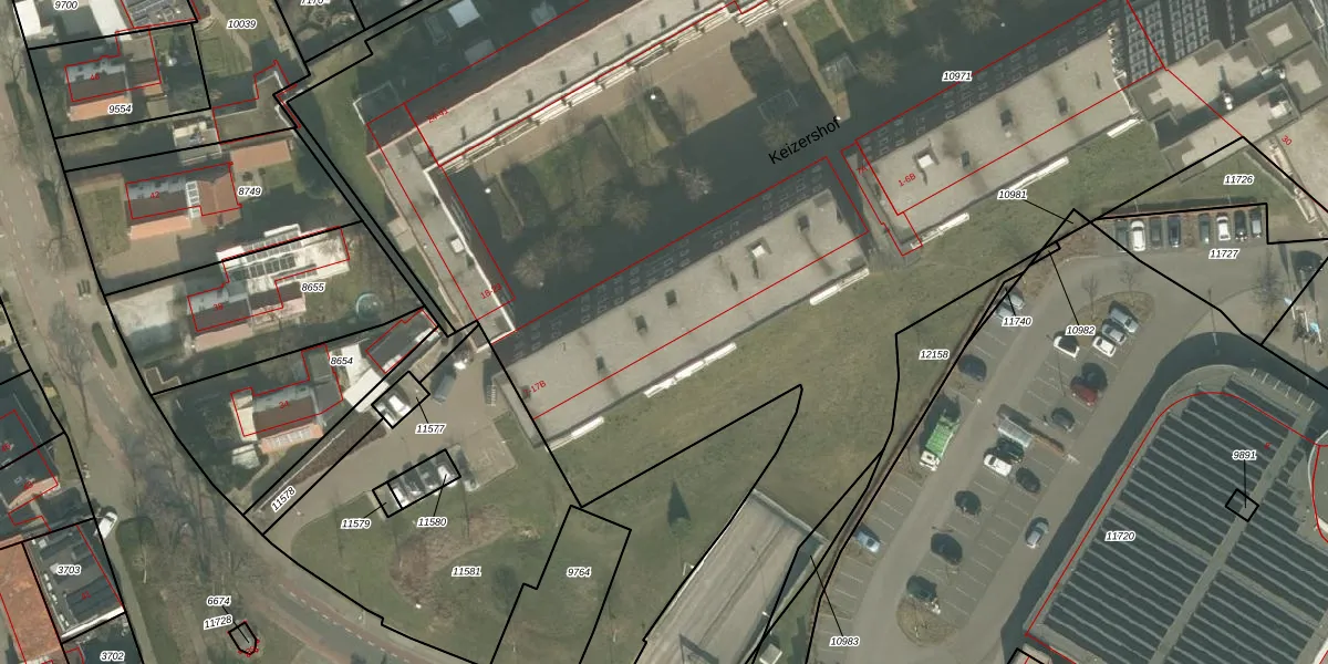 Het perceel waarop Keizershof 11 staat heeft een oppervlakte van 1,5 ha. Dit is een zeer groot perceel. De perceeloppervlakte wordt geregistreerd door het Kadaster. Gedetailleerde informatie over de maten van dit perceel kunt u vinden in het rapport Kadastrale kaart met maatvoering van Keizershof 11.