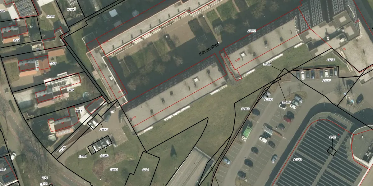 Het perceel waarop Keizershof 13 staat heeft een oppervlakte van 1,5 ha. Dit is een zeer groot perceel. De perceeloppervlakte wordt geregistreerd door het Kadaster. Gedetailleerde informatie over de maten van dit perceel kunt u vinden in het rapport Kadastrale kaart met maatvoering van Keizershof 13.
