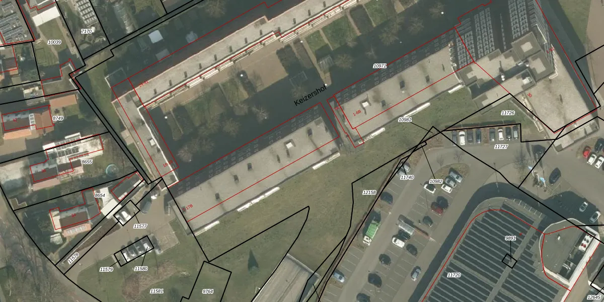 Het perceel waarop Keizershof 15 staat heeft een oppervlakte van 1,5 ha. Dit is een zeer groot perceel. De perceeloppervlakte wordt geregistreerd door het Kadaster. Gedetailleerde informatie over de maten van dit perceel kunt u vinden in het rapport Kadastrale kaart met maatvoering van Keizershof 15.