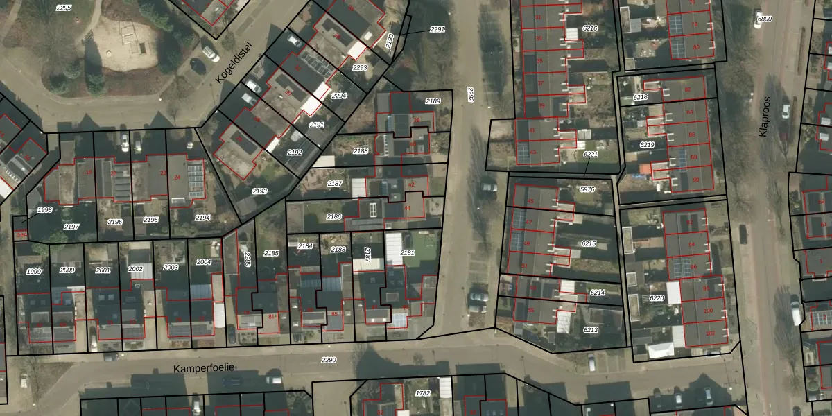 Kogeldistel 44 is gelegen op kadastraal perceel VRY00T2186. Deze kadastrale aanduiding is uniek en wordt gebruikt door het Kadaster om eigendomsrechten en andere zakelijke rechten vast te leggen. Het perceel maakt onderdeel uit van de kadastrale gemeente Venray.