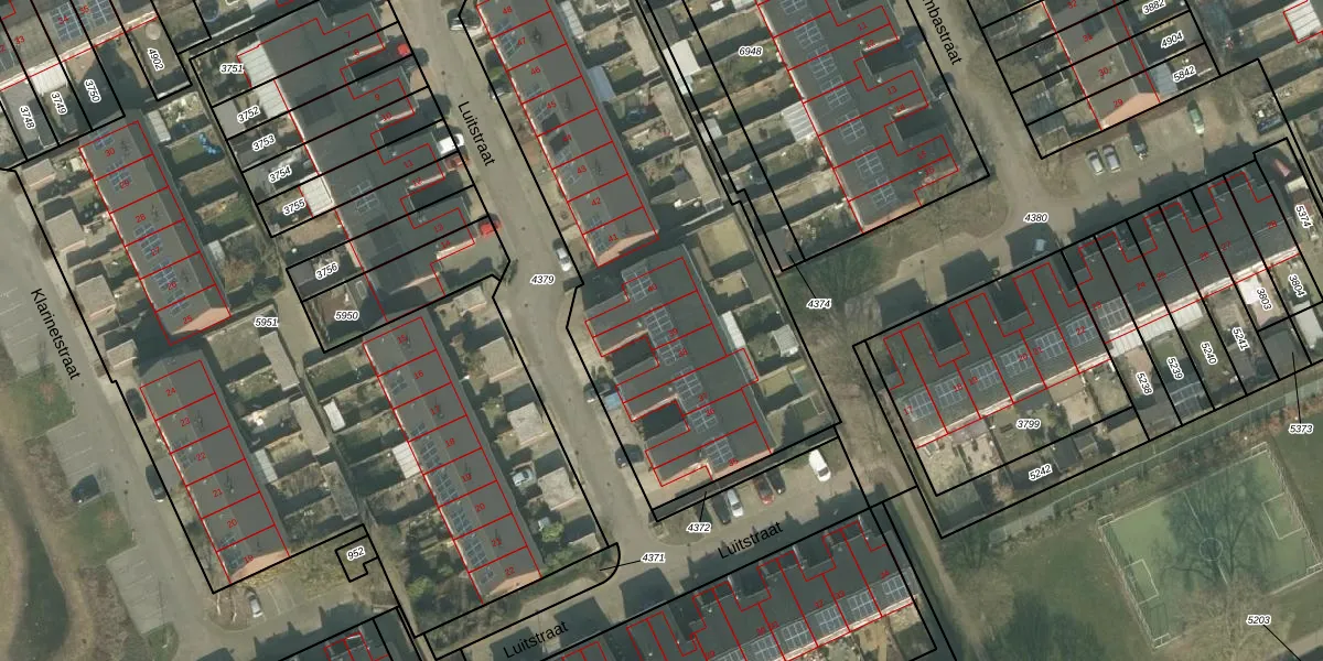 Het perceel waarop Luitstraat 39 staat heeft een oppervlakte van 5182 m². Dit is een zeer groot perceel. De perceeloppervlakte wordt geregistreerd door het Kadaster. Gedetailleerde informatie over de maten van dit perceel kunt u vinden in het rapport Kadastrale kaart met maatvoering van Luitstraat 39.
