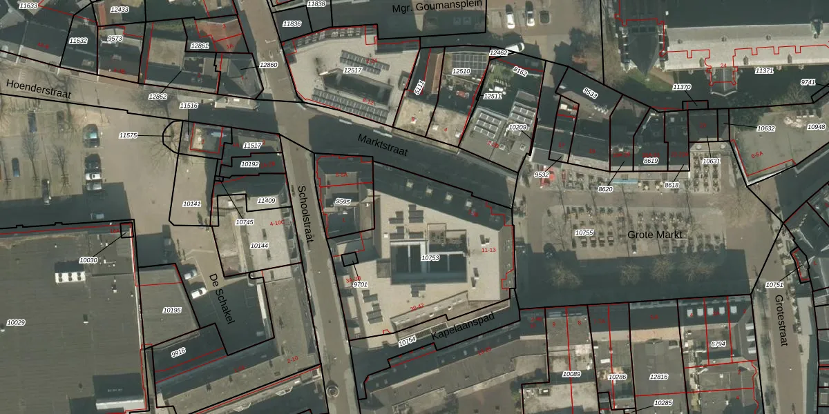 Het perceel waarop Marktstraat 11 staat heeft een oppervlakte van 1320 m². Dit is een zeer groot perceel. De perceeloppervlakte wordt geregistreerd door het Kadaster. Gedetailleerde informatie over de maten van dit perceel kunt u vinden in het rapport Kadastrale kaart met maatvoering van Marktstraat 11.