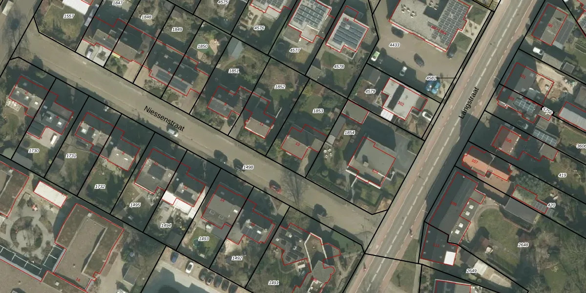 Het perceel waarop Niessenstraat 13 staat heeft een oppervlakte van 458 m². Dit is een groot perceel. De perceeloppervlakte wordt geregistreerd door het Kadaster. Gedetailleerde informatie over de maten van dit perceel kunt u vinden in het rapport Kadastrale kaart met maatvoering van Niessenstraat 13.