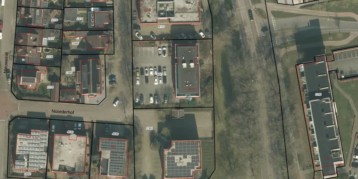 Het perceel waarop Noorderhof 10 staat heeft een oppervlakte van 1710 m². Dit is een zeer groot perceel. De perceeloppervlakte wordt geregistreerd door het Kadaster. Gedetailleerde informatie over de maten van dit perceel kunt u vinden in het rapport Kadastrale kaart met maatvoering van Noorderhof 10.