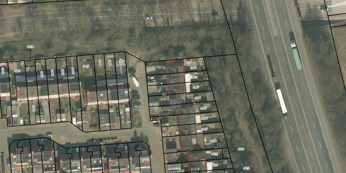 Pavanestraat 76 is gelegen op kadastraal perceel VRY00T3993. Deze kadastrale aanduiding is uniek en wordt gebruikt door het Kadaster om eigendomsrechten en andere zakelijke rechten vast te leggen. Het perceel maakt onderdeel uit van de kadastrale gemeente Venray.