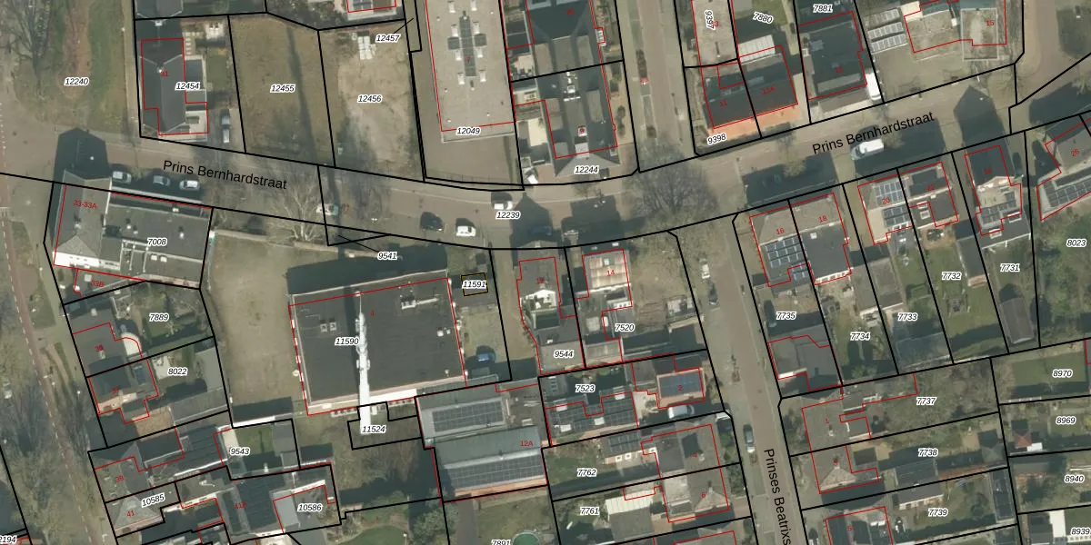 Het perceel waarop Prins Bernhardstraat 12 staat heeft een oppervlakte van 740 m². Dit is een groot perceel. De perceeloppervlakte wordt geregistreerd door het Kadaster. Gedetailleerde informatie over de maten van dit perceel kunt u vinden in het rapport Kadastrale kaart met maatvoering van Prins Bernhardstraat 12.