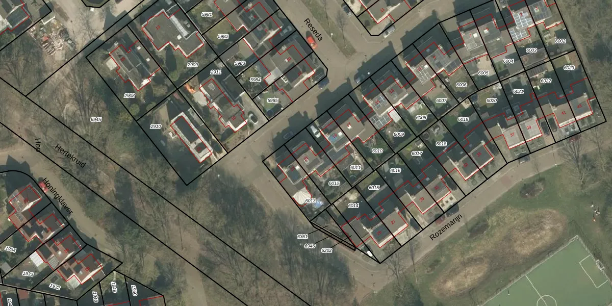Het perceel waarop Rozemarijn 21 staat heeft een oppervlakte van 222 m². Dit is een middelgroot perceel. De perceeloppervlakte wordt geregistreerd door het Kadaster. Gedetailleerde informatie over de maten van dit perceel kunt u vinden in het rapport Kadastrale kaart met maatvoering van Rozemarijn 21.