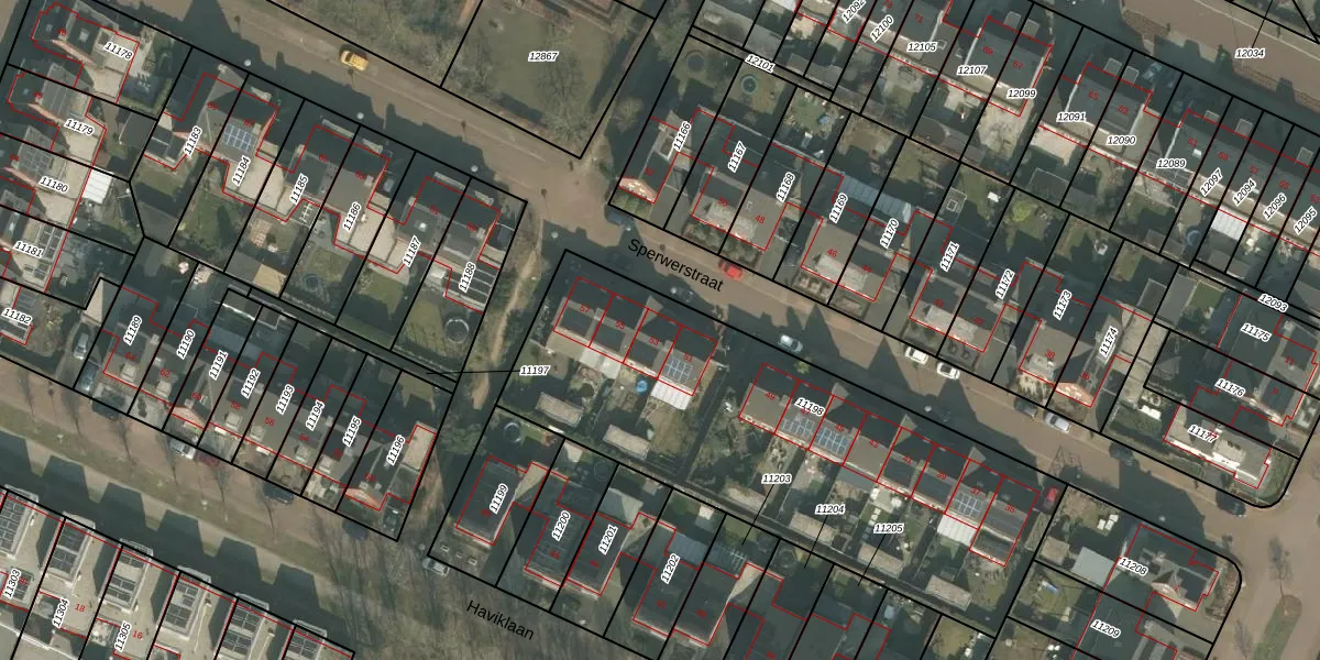 Het perceel waarop Sperwerstraat 53 staat heeft een oppervlakte van 2165 m². Dit is een zeer groot perceel. De perceeloppervlakte wordt geregistreerd door het Kadaster. Gedetailleerde informatie over de maten van dit perceel kunt u vinden in het rapport Kadastrale kaart met maatvoering van Sperwerstraat 53.