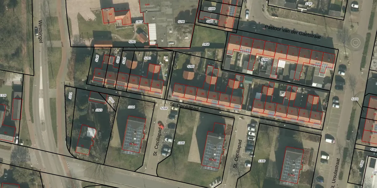 Het perceel waarop St. Ceciliapad 22 staat heeft een oppervlakte van 1930 m². Dit is een zeer groot perceel. De perceeloppervlakte wordt geregistreerd door het Kadaster. Gedetailleerde informatie over de maten van dit perceel kunt u vinden in het rapport Kadastrale kaart met maatvoering van St. Ceciliapad 22.