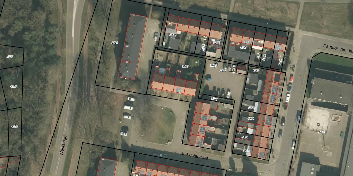 St. Luciastraat 12 is gelegen op kadastraal perceel VRY00L5108. Deze kadastrale aanduiding is uniek en wordt gebruikt door het Kadaster om eigendomsrechten en andere zakelijke rechten vast te leggen. Het perceel maakt onderdeel uit van de kadastrale gemeente Venray.