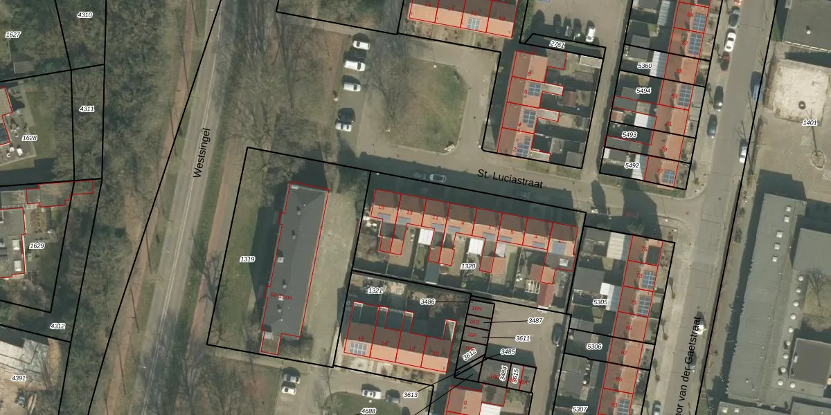 St. Luciastraat 13 is gelegen op kadastraal perceel VRY00L1320. Deze kadastrale aanduiding is uniek en wordt gebruikt door het Kadaster om eigendomsrechten en andere zakelijke rechten vast te leggen. Het perceel maakt onderdeel uit van de kadastrale gemeente Venray.