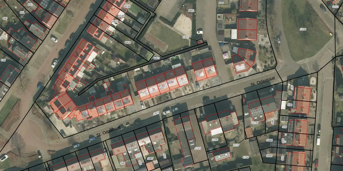 Het perceel waarop St. Odastraat 23 staat heeft een oppervlakte van 9662 m². Dit is een zeer groot perceel. De perceeloppervlakte wordt geregistreerd door het Kadaster. Gedetailleerde informatie over de maten van dit perceel kunt u vinden in het rapport Kadastrale kaart met maatvoering van St. Odastraat 23.