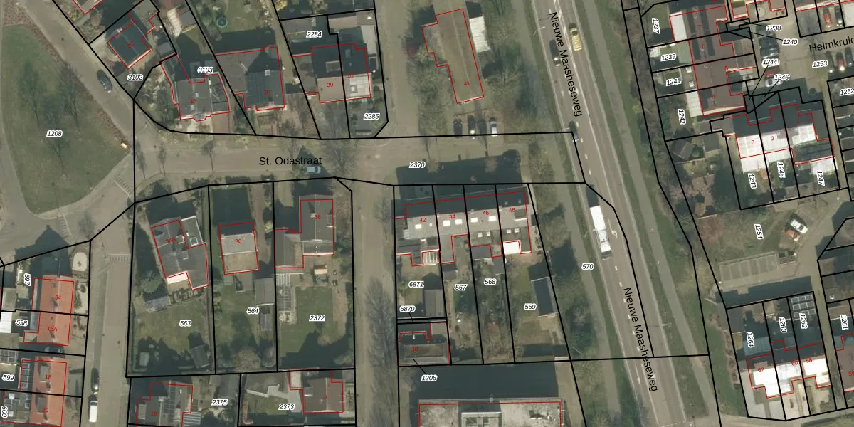 St. Odastraat 42 is gelegen op kadastraal perceel VRY00T6871. Deze kadastrale aanduiding is uniek en wordt gebruikt door het Kadaster om eigendomsrechten en andere zakelijke rechten vast te leggen. Het perceel maakt onderdeel uit van de kadastrale gemeente Venray.
