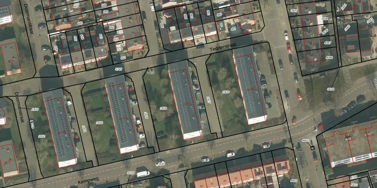 Het perceel waarop Tedderstraat 13 staat heeft een oppervlakte van 1272 m². Dit is een zeer groot perceel. De perceeloppervlakte wordt geregistreerd door het Kadaster. Gedetailleerde informatie over de maten van dit perceel kunt u vinden in het rapport Kadastrale kaart met maatvoering van Tedderstraat 13.