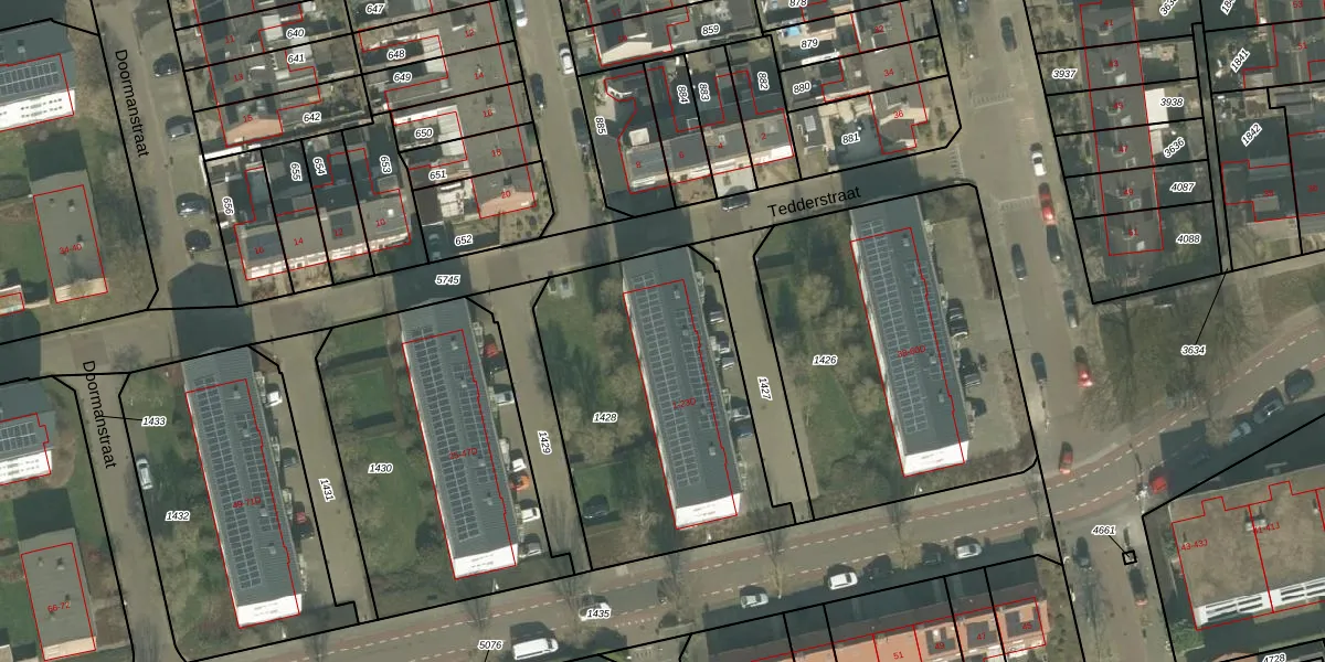 Het perceel waarop Tedderstraat 23 staat heeft een oppervlakte van 1272 m². Dit is een zeer groot perceel. De perceeloppervlakte wordt geregistreerd door het Kadaster. Gedetailleerde informatie over de maten van dit perceel kunt u vinden in het rapport Kadastrale kaart met maatvoering van Tedderstraat 23.