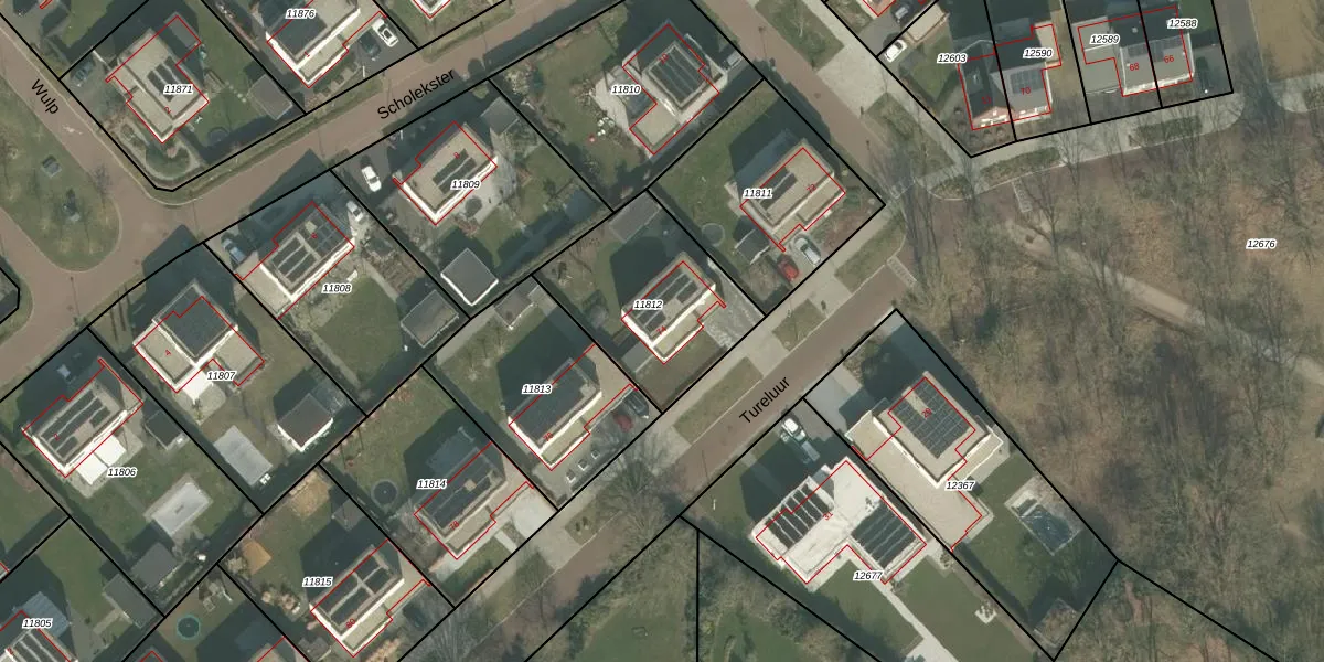 Het perceel waarop Tureluur 74 staat heeft een oppervlakte van 594 m². Dit is een groot perceel. De perceeloppervlakte wordt geregistreerd door het Kadaster. Gedetailleerde informatie over de maten van dit perceel kunt u vinden in het rapport Kadastrale kaart met maatvoering van Tureluur 74.