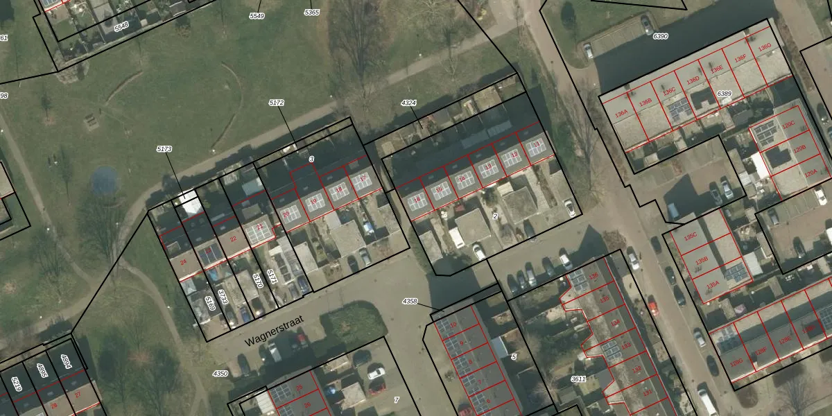 Het perceel waarop Wagnerstraat 16 staat heeft een oppervlakte van 1245 m². Dit is een zeer groot perceel. De perceeloppervlakte wordt geregistreerd door het Kadaster. Gedetailleerde informatie over de maten van dit perceel kunt u vinden in het rapport Kadastrale kaart met maatvoering van Wagnerstraat 16.