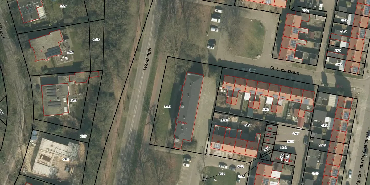 Het perceel waarop Westsingel 104 staat heeft een oppervlakte van 1470 m². Dit is een zeer groot perceel. De perceeloppervlakte wordt geregistreerd door het Kadaster. Gedetailleerde informatie over de maten van dit perceel kunt u vinden in het rapport Kadastrale kaart met maatvoering van Westsingel 104.