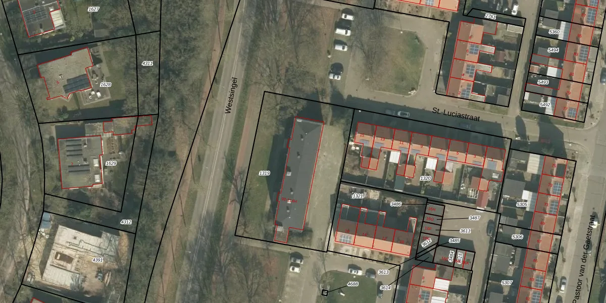 Het perceel waarop Westsingel 108 staat heeft een oppervlakte van 1470 m². Dit is een zeer groot perceel. De perceeloppervlakte wordt geregistreerd door het Kadaster. Gedetailleerde informatie over de maten van dit perceel kunt u vinden in het rapport Kadastrale kaart met maatvoering van Westsingel 108.
