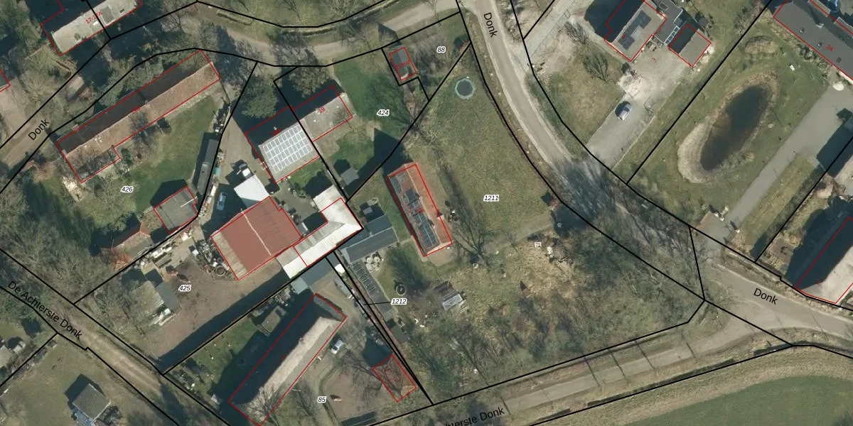 Het perceel waarop Donk 15 staat heeft een oppervlakte van 3450 m². Dit is een zeer groot perceel. De perceeloppervlakte wordt geregistreerd door het Kadaster. Gedetailleerde informatie over de maten van dit perceel kunt u vinden in het rapport Kadastrale kaart met maatvoering van Donk 15.