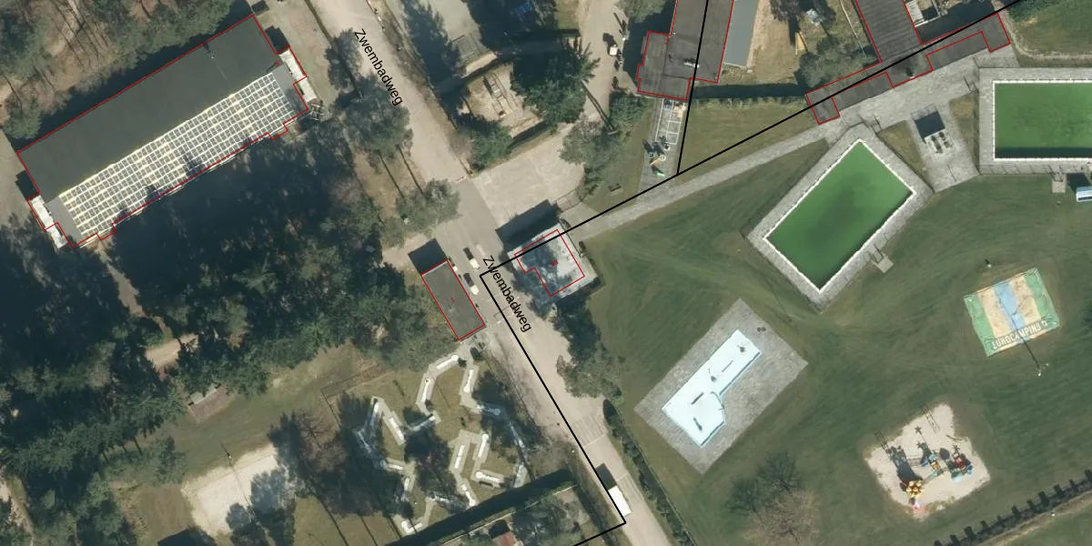 Het perceel waarop Zwembadweg 1-a staat heeft een oppervlakte van 4,0 ha. Dit is een zeer groot perceel. De perceeloppervlakte wordt geregistreerd door het Kadaster. Gedetailleerde informatie over de maten van dit perceel kunt u vinden in het rapport Kadastrale kaart met maatvoering van Zwembadweg 1-a.